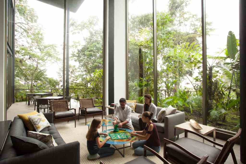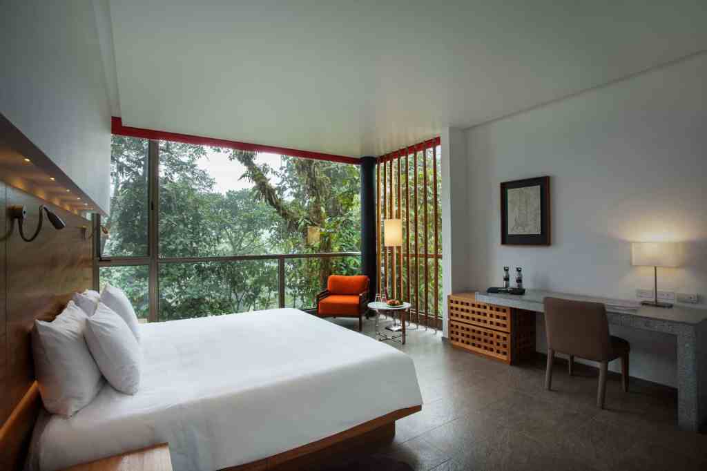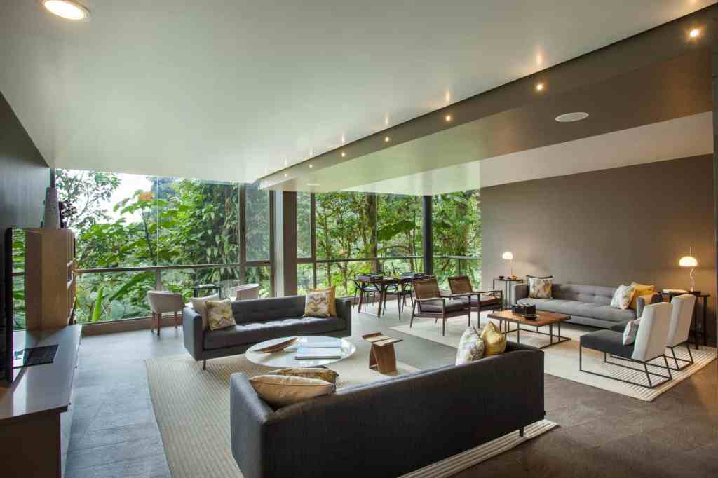 The lodge features luxurious rooms and suites, designed to blend in with the natural environment through big glass walls while providing high levels of comfort at the same time. Contemporary and featuring modernist design and décor mixes warm earth tones, steel, stone and glass. Open-air terrace provides a space for guests to enjoy splendid views and relax to the sounds of the forest and its inhabitants.