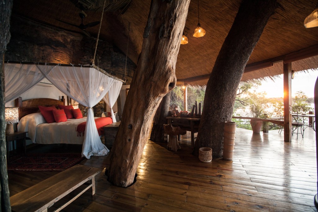 The Tongabezi Lodge offers a selection of seven different types of accommodation – one cottage and six various house types, individually styled and furnished in African style and can accommodate two to five guests. The River Cottages are situated on the banks of Zambezi River; Honeymoon House with the perfect view and romantic atmosphere; Bird House features an open-air bathtub and a private terrace; Tree House is set amongst the branches of three riverine Ebony trees; Dog House with a sensation of Zambezi River running underneath the rooms during high water; Nut House combines eclectic art, textiles and textures from around the African continent; Garden House with a private, safe space for family getaways.
