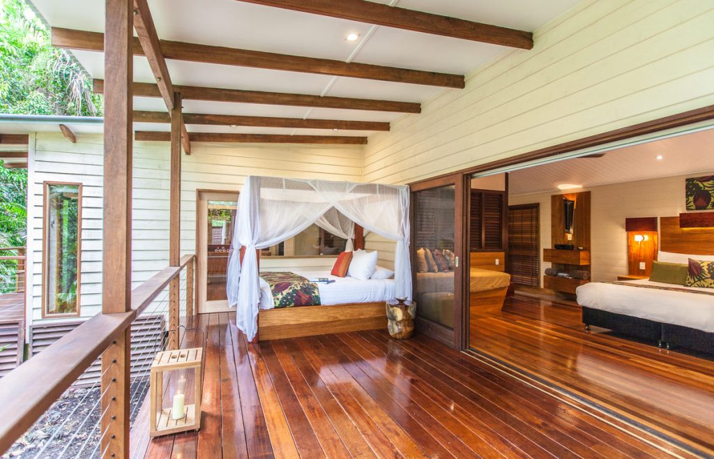 This eco lodge consists of private, luxury treehouses, completely immersed into nature. This luxurious retreat is equipped with contemporary furnishings, framed by local timbers with a feeling of complete connection to nature. There are four types of treehouses, Daintree, Garden, Deluxe and River treehouse, all elegantly styled in a beautiful private setting within the rainforest and tropical gardens and balcony with hammocks. Two types of spacious suites, the Billabong Suite and the Lodge Suite offer include a spacious veranda overlooking the rainforest.