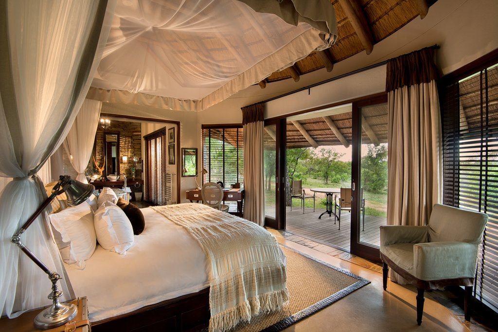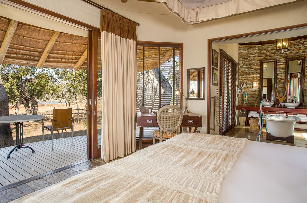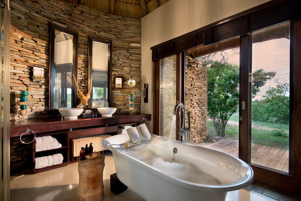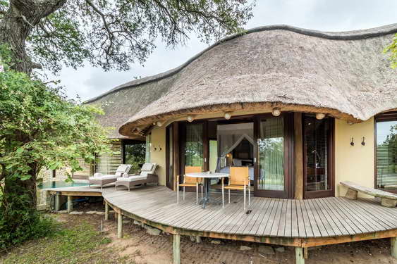Just a few luxury lodges and homes provide full privacy and luxury for its guests. In total there are 7 large luxury suites and two bedroom villas. All suites overlook the dam and have a relaxing sitting area with its own gas fireplace, a beautiful bathroom with a spacious shower and separate bathtub, a private deck with loungers and an outdoor shower. There are Luxury Suites and two Luxury Pool Suites located furthest from the main lodge and offer more privacy including a private plunge pool on the deck. Also there is Marula Suite with 366m² of space with a large outdoor deck featuring two en-suite bedrooms each with their own shower and separate bath, a large living room, a dining room and kitchen. The Main Lodge is a spacious common area, where guests can gather and relax.